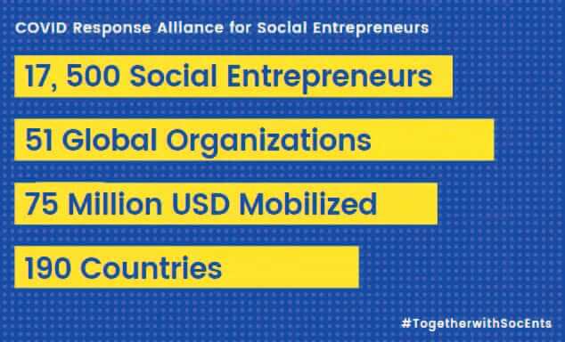 “COVID Response Alliance for Social Entrepreneurs” (Sosyal Girişimciler için COVID Mücadelesi Birliği) çevresinde örgütlenmiş dünya çapındaki 40’tan fazla sosyal girişimci ağı, veri, tecrübe ve hareket kabiliyetleri etrafında işbirliği yaparak kapsayıcı, eşit ve sürdürülebilir bir değişim modeli yaratmaya çalışıyorlar.