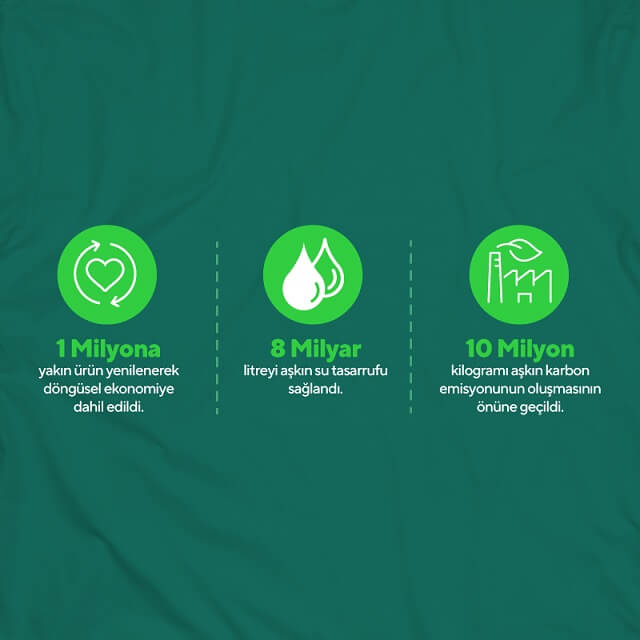 İşbirliğimiz kapsamında bugüne dek 1 milyon ürün yenilendi. Yenilenen ürünlerin tekrar döngüye katılmasıyla 8 milyar litre su tasarrufu sağlandı ve 10 milyon kilogram karbon emisyonunun önüne geçildi. Bir başka ifadeyle 14,7 milyon insanın bir yıllık içme suyu ihtiyacına eş değer su tasarrufu sağlandı ve 11.319 adet evin yıllık elektrik ihtiyacına eş değer karbon emisyonu önlendi diyebiliriz.