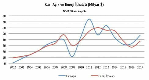 “Ekonomistlerin açıklamaları bir yana, iklim bilimi ve toplumsal siya­setle uğraşan bizler için ortada çok keskin bir resim var: Karşımızdaki bal gibi de yüksek karbon krizi. Fo­sil yakıt bağımlılığının atması, artan bağımlılık ile artan ithalat resmi bu cari açık tartışmalarının önemli bir tarafını oluşturuyor” diyor Algedik ve ekliyor: “1984’ten 2001’e kadar bu ülkede cari açık toplamı 21,8 milyar dolar idi. 2002’den 2017’ye kadar cari açık toplamı ise tam 549 milyar dolar. (…) Bu ülkede 2000 yı­lında 13 milyon ton kömür, 31 mil­yon petrol ve 14,8 milyar metreküp doğalgaz ithal ediliyordu. 36 milyon ton çimento üretiyordu, karayolları da 7,2 milyon araca sahipti. Şimdi 36 milyon ton kömür, 50 milyon ton petrol ve 46 milyar metreküp doğal­gaz ithal ediyoruz. Yerli ve yabancı çimento lobilerinin eline geçen çi­mento pazarı yıllık 83 milyon ton çi­mento üretimine ulaştı. Sokaklarda petrol yakan 22 milyon araç var ar­tık. Sonuç, Türkiye 2002-2017 arası enerji ithalatı ile 563 milyar doları dışarı verdi! Dünyanın fosil yakıt üreticilerinin cebine bu halk 563 milyar dolar koydu. Yani 563 milyar dolar biri­lerinin cebine gitsin diye 549 mil­yar dolar cari açık verdik”.