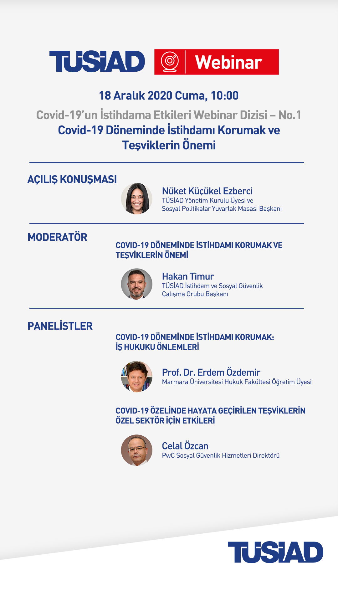18 Aralık 2020 tarihinde, akademiden ve özel sektörden uzmanlarla beraber , “COVID-19 Döneminde İstihdamı Korumak ve Teşviklerin Önemi” konusunu ele almak üzere TÜSİAD bir webinar gerçekleştiriyor. Düzenlenecek online etkinliğe İnsan Kaynakları ekipleri başta olmak üzere tüm özel sektör mensuplarını davet ediliyor.