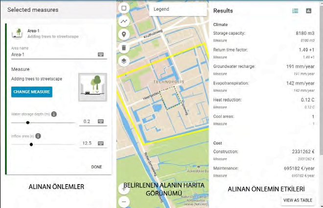 (Climate Resilient City Toolbox), karar vericilere bir bölgenin iklim değişikliğinin sel, kuraklık, aşırı hava olayları ve ısı adaları gibi olumsuz etkilerine karşı hangi uyum eyleminin daha etkin olacağı konusunda rehberlik ediyor. Kullanıcılar, çalışma alanlarını harita üzerinden seçip ulaşmak istediği hedefleri belirleyebiliyor; son olarak ise bölgeye uygulanması düşünülen uyumeylemlerini (binalarda yeşil çatı uygulaması, yeşil altyapı bileşenleri vb.) seçilebiliyor. Bu işlemlerin ardından araç; kullanıcılara belirlenen uyum eylemlerinin aylık, yıllık ve ilk yatırım masrafları, belirlenen uyum eylemlerinin ne ölçüde etkili olacağı ve kullanıcının modellemenin başında belirlemiş olduğu hedefe ne kadar yaklaştığı gibi bilgileri çıktı olarak sunuyor. Yani araç, özellikle yerel karar vericilerin bir uyum eylemini hayata geçirmeden eylemin fayda ve maliyetini tespit edip en optimal eylemi seçebilmelerine imkân sağlıyor.