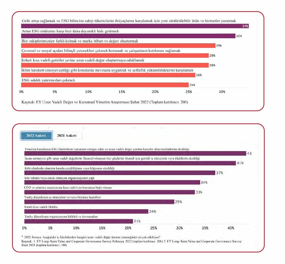 6) ESG odaklı yatırımcıları çekebilmek. Aynı çalışmada, uzun dönemli hedeflere yeterince odaklanılamaması önündeki nedenler de sorgulanmış ve nedenler şöyle sıralanmış: